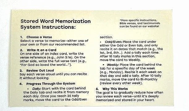 The Stored Word Advantage Our time-tested system eliminates the guesswork from Scripture memorization. Unlike apps or digital methods, this tactile approach helps verses stick in your memory for life. The structured review schedule ensures you retain what you learn while steadily adding new verses.